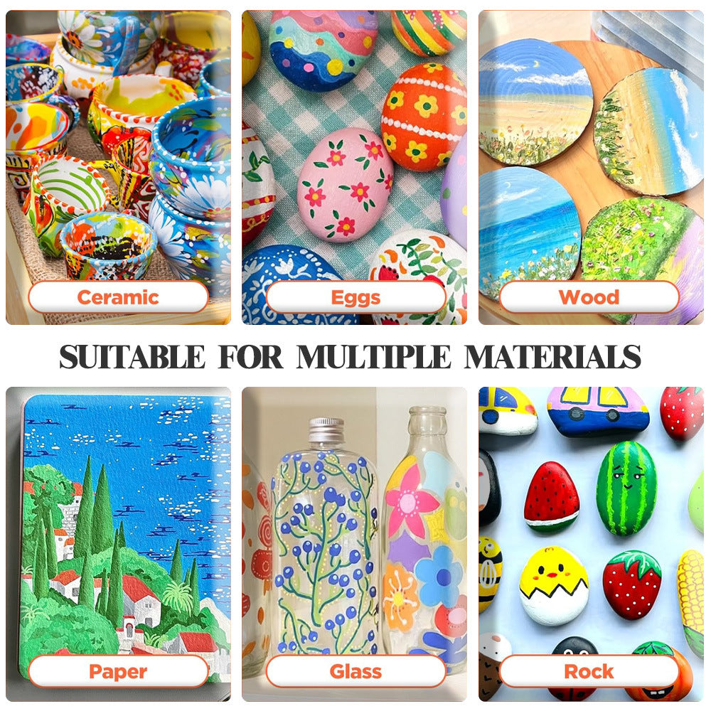 1-5mm Brush Tip for Precision and Versatility: Designed with a 1-5mm brush tip, these acrylic paint pens provide you with the flexibility to create both detailed designs and broad strokes. Use them as soft tips paint markers for intricate details or brush acrylic paint markers for larger areas. Whether you're painting on canvas, wood, or rocks, these markers are perfect for all artistic techniques.